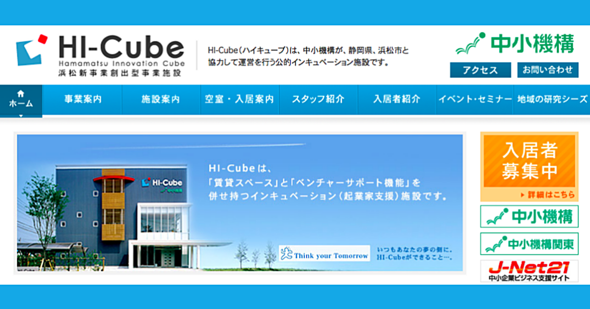 浜松イノベーションキューブ(HI-Cube)とは起業を目指す個人、ベンチャー企業や新事業展開に取り組む中小企業に対し事業スペースを提供するインキュベーション施設。独立行政法人中小企業基盤整備機構が平成18年8月末に施設の利用を開始しました。